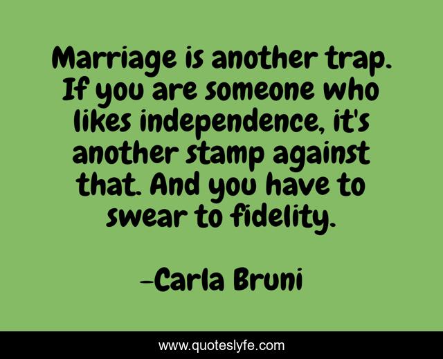 This page presents the quote "Marriage is another trap. If you are someone who likes independence, it's another stamp against that. And you have to swear to fidelity.". Author of this quote is Carla Bruni. This quote is about swear, marriage,.