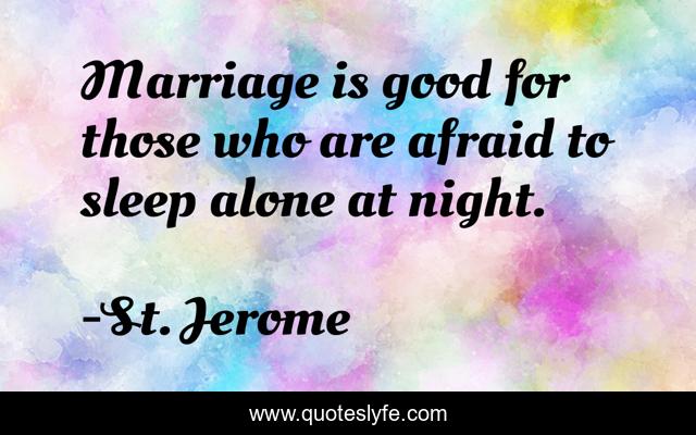 This page presents the quote "Marriage is good for those who are afraid to sleep alone at night.". Author of this quote is St. Jerome. This quote is about alone, marriage, sleep,.