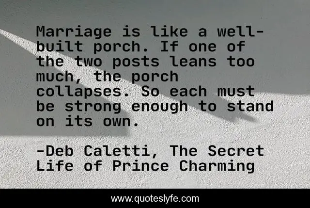 This page presents the quote "Marriage is like a well-built porch. If one of the two posts leans too much, the porch collapses. So each must be strong enough to stand on its own.". Author of this quote is Deb Caletti, The Secret Life of Prince Charming. This quote is about two, collapses, marriage, stand, strong, well-built,.