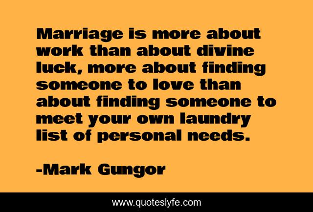 This page presents the quote "Marriage is more about work than about divine luck, more about finding someone to love than about finding someone to meet your own laundry list of personal needs.". Author of this quote is Mark Gungor. This quote is about enthusiasm, marriage, inspirational,.
