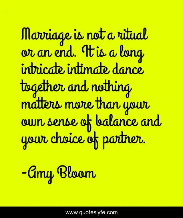 This page presents the quote "Marriage is not a ritual or an end. It is a long intricate intimate dance together and nothing matters more than your own sense of balance and your choice of partner.". Author of this quote is Amy Bloom. .