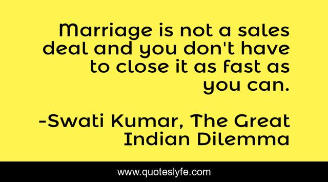 This page presents the quote "Marriage is not a sales deal and you don't have to close it as fast as you can.". Author of this quote is Swati Kumar, The Great Indian Dilemma. This quote is about arranged-marriages, marriage, commitment,.