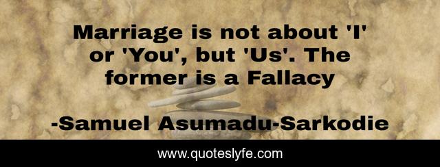 This page presents the quote "Marriage is not about 'I' or 'You', but 'Us'. The former is a Fallacy". Author of this quote is Samuel Asumadu-Sarkodie. This quote is about proverbs, words-of-knowledge, discernment, parables, words-of-wisdom, inspiration,.