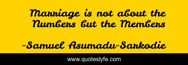 This page presents the quote "Marriage is not about the Numbers but the Members". Author of this quote is Samuel Asumadu-Sarkodie. This quote is about proverbs, words-of-knowledge, discernment, parables, words-of-wisdom, inspiration,.