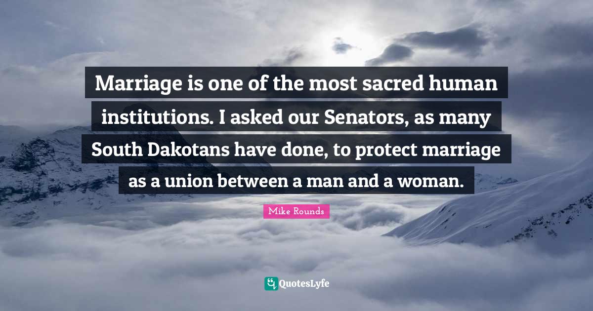 This page presents the quote "Marriage is one of the most sacred human institutions. I asked our Senators, as many South Dakotans have done, to protect marriage as a union between a man and a woman.". Author of this quote is Mike Rounds. This quote is about institutions, men, protect, south, senators, sacred, done, marriage,.