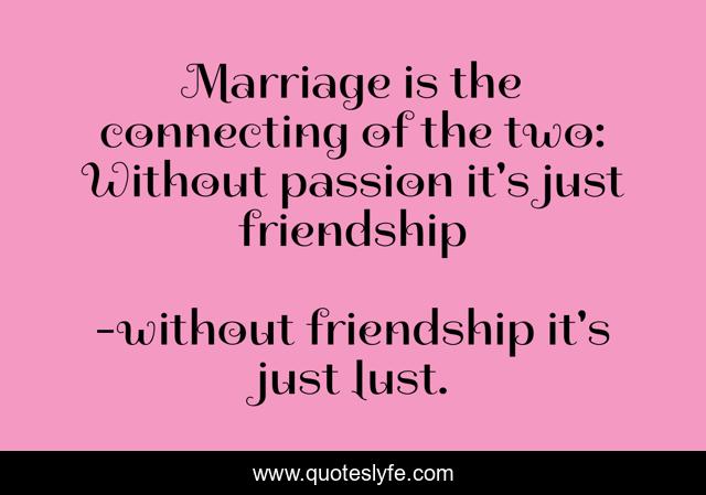 This page presents the quote "Marriage is the connecting of the two: Without passion it's just friendship". Author of this quote is without friendship it's just lust.. .