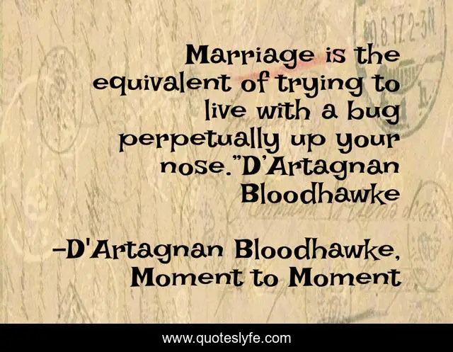 This page presents the quote "Marriage is the equivalent of trying to live with a bug perpetually up your nose.”D’Artagnan Bloodhawke". Author of this quote is D'Artagnan Bloodhawke, Moment to Moment. This quote is about humorous, funny, comedy, inspirational, enthusiasm,.