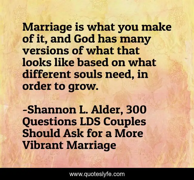 "Shannon L. Alder, 300 Questions LDS Couples Should Ask for a More Vibrant Marriage Quotes." Quoteslyfe.com, 2025. Sat. 06 Dec. 2025. <https://www.quoteslyfe.com/quote/Marriage-is-what-you-make-of-it-231760>.
