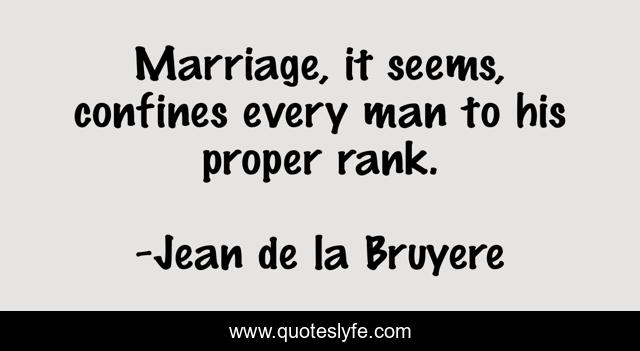 This page presents the quote "Marriage, it seems, confines every man to his proper rank.". Author of this quote is Jean de la Bruyere. This quote is about seems, rank, man,.