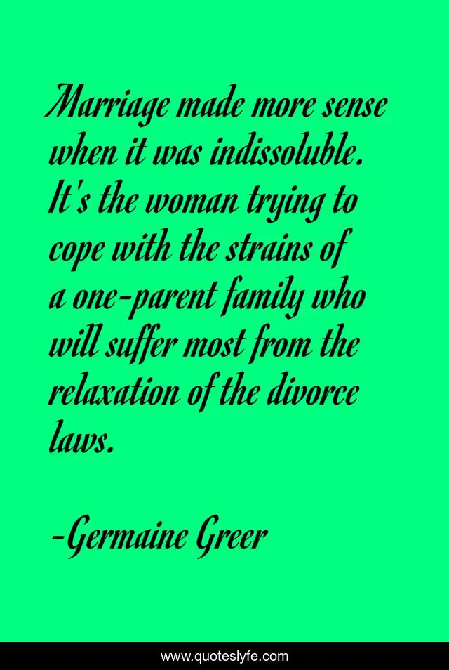 This page presents the quote "Marriage made more sense when it was indissoluble. It's the woman trying to cope with the strains of a one-parent family who will suffer most from the relaxation of the divorce laws.". Author of this quote is Germaine Greer. This quote is about divorce, woman, marriage,.