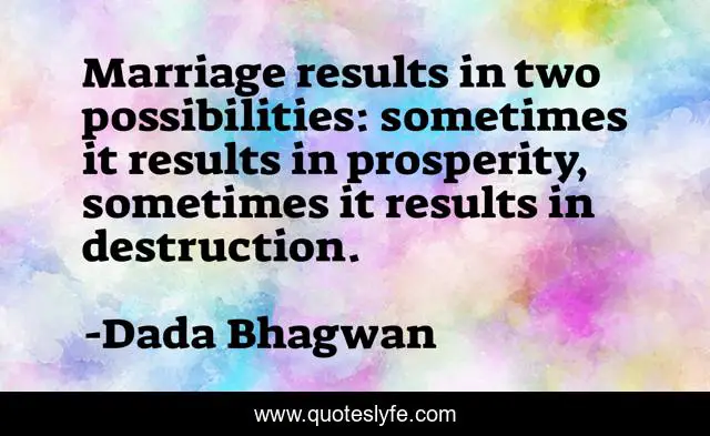 This page presents the quote "Marriage results in two possibilities: sometimes it results in prosperity, sometimes it results in destruction.". Author of this quote is Dada Bhagwan. This quote is about prosperity, spiritual, love, marriage, pure-love, affection, destruction,.