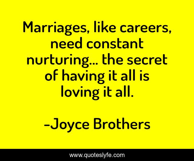 This page presents the quote "Marriages, like careers, need constant nurturing... the secret of having it all is loving it all.". Author of this quote is Joyce Brothers. This quote is about need, secret, loving,.