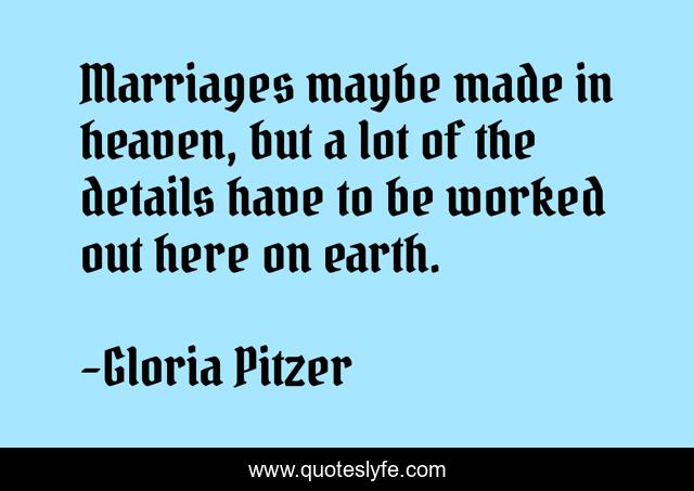 This page presents the quote "Marriages maybe made in heaven, but a lot of the details have to be worked out here on earth.". Author of this quote is Gloria Pitzer. This quote is about romance, enthusiasm, inspirational,.
