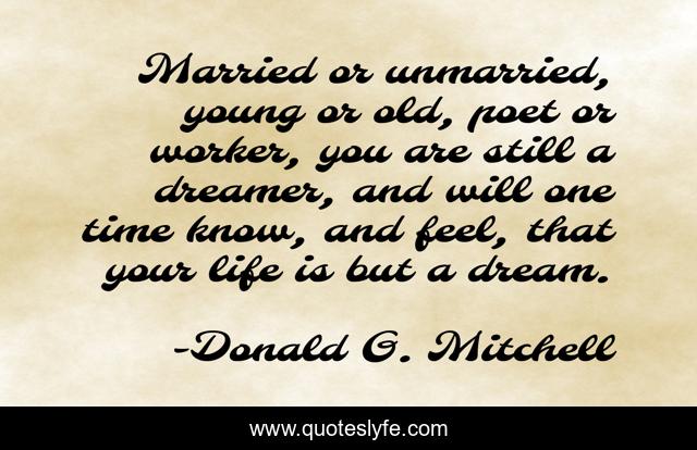 This page presents the quote "Married or unmarried, young or old, poet or worker, you are still a dreamer, and will one time know, and feel, that your life is but a dream.". Author of this quote is Donald G. Mitchell. This quote is about life, dream, time,.