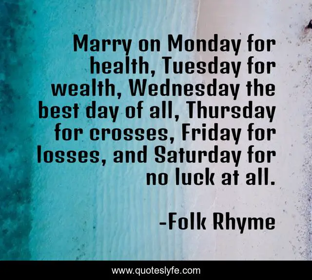 This page presents the quote "Marry on Monday for health, Tuesday for wealth, Wednesday the best day of all, Thursday for crosses, Friday for losses, and Saturday for no luck at all.". Author of this quote is Folk Rhyme. This quote is about marriage, luck,.