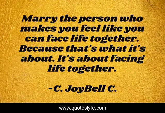 This page presents the quote "Marry the person who makes you feel like you can face life together. Because that's what it's about. It's about facing life together.". Author of this quote is C. JoyBell C.. This quote is about relationships, love, the-person-you-stay-with, who-to-marry, wisdom, what-s-marriage-about, how-to-get-married, affection,.