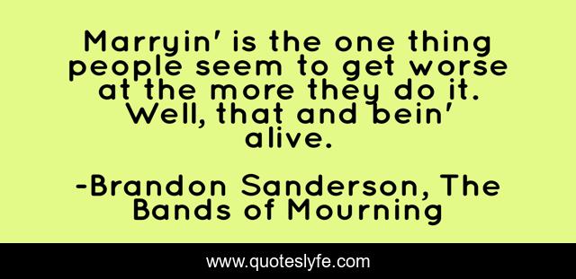 This page presents the quote "Marryin' is the one thing people seem to get worse at the more they do it. Well, that and bein' alive.". Author of this quote is Brandon Sanderson, The Bands of Mourning. This quote is about life, death, marriage,.