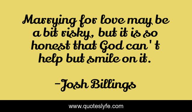 This page presents the quote "Marrying for love may be a bit risky, but it is so honest that God can't help but smile on it.". Author of this quote is Josh Billings. This quote is about god, marriage, affection, love,.