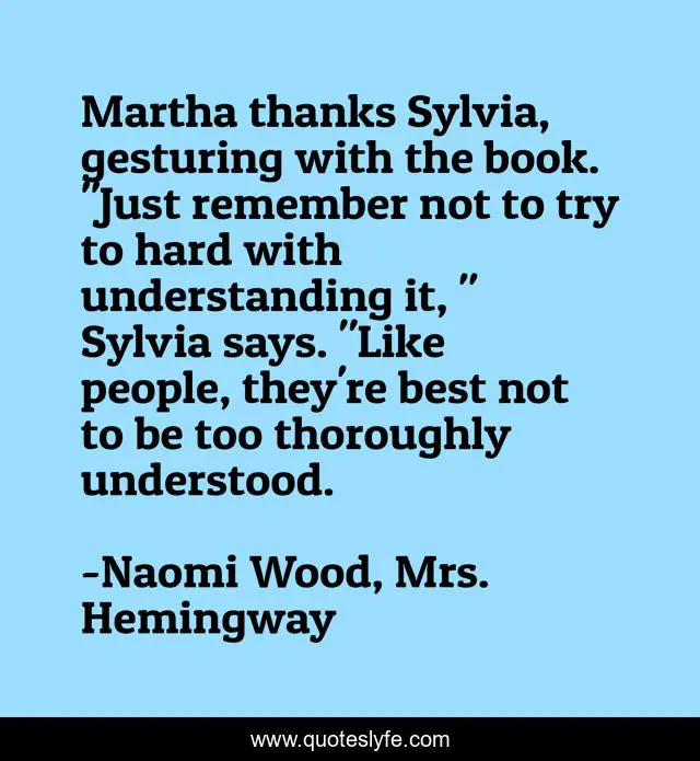 This page presents the quote "Martha thanks Sylvia, gesturing with the book. "Just remember not to try to hard with understanding it, " Sylvia says. "Like people, they're best not to be too thoroughly understood.". Author of this quote is Naomi Wood, Mrs. Hemingway. This quote is about ernest-hemingway, historical-fiction,.