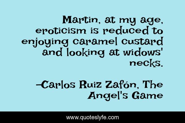 This page presents the quote "Martin, at my age, eroticism is reduced to enjoying caramel custard and looking at widows' necks.". Author of this quote is Carlos Ruiz Zafón, The Angel's Game. This quote is about humour, fiction,.