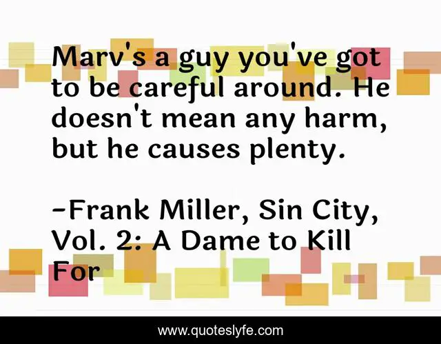 This page presents the quote "Marv's a guy you've got to be careful around. He doesn't mean any harm, but he causes plenty.". Author of this quote is Frank Miller, Sin City, Vol. 2: A Dame to Kill For. This quote is about marv, comic-book, crime,.