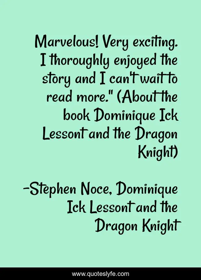 This page presents the quote "Marvelous! Very exciting. I thoroughly enjoyed the story and I can't wait to read more." (About the book Dominique Ick Lessont and the Dragon Knight)". Author of this quote is Stephen Noce, Dominique Ick Lessont and the Dragon Knight. This quote is about and, ick, dominique, lessont, knight, adventure, young, dragon, teen,.