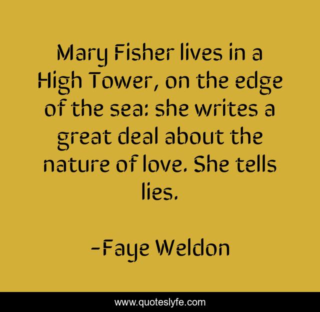 This page presents the quote "Mary Fisher lives in a High Tower, on the edge of the sea: she writes a great deal about the nature of love. She tells lies.". Author of this quote is Faye Weldon. This quote is about she-devil, love, jealousy, revenge, hate, affection,.