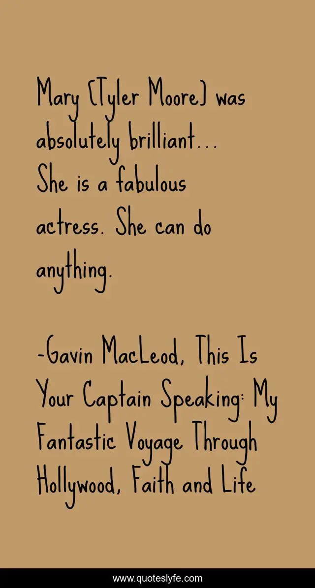 This page presents the quote "Mary [Tyler Moore] was absolutely brilliant... She is a fabulous actress. She can do anything.". Author of this quote is Gavin MacLeod, This Is Your Captain Speaking: My Fantastic Voyage Through Hollywood, Faith and Life. This quote is about autobiography, mary-tyler-moore-show, mary-tyler-moore, memoir, this-is-your-captain-speaking,.