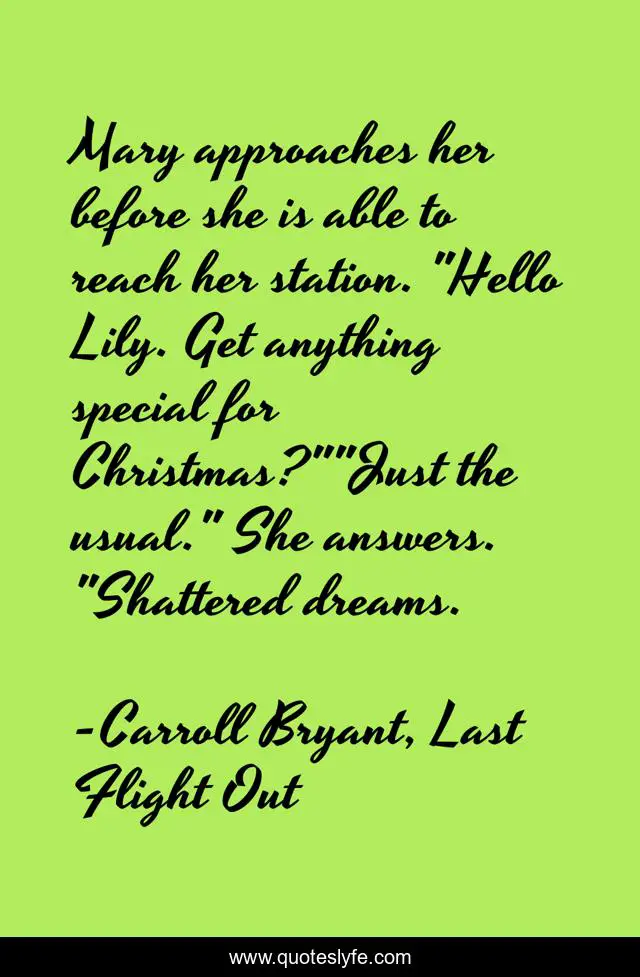 This page presents the quote "Mary approaches her before she is able to reach her station. "Hello Lily. Get anything special for Christmas?""Just the usual." She answers. "Shattered dreams.". Author of this quote is Carroll Bryant, Last Flight Out. This quote is about lovers, love, romantic, fiction-novel, lovers-love-story, fictional, fiction, romance, romance-novels,.