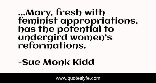 This page presents the quote "...Mary, fresh with feminist appropriations, has the potential to undergird women’s reformations.". Author of this quote is Sue Monk Kidd. This quote is about mary, feminism, women,.