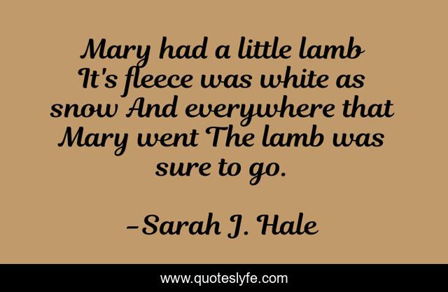 This page presents the quote "Mary had a little lamb It's fleece was white as snow And everywhere that Mary went The lamb was sure to go.". Author of this quote is Sarah J. Hale. .
