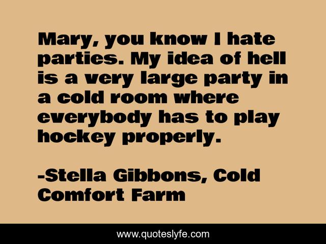This page presents the quote "Mary, you know I hate parties. My idea of hell is a very large party in a cold room where everybody has to play hockey properly.". Author of this quote is Stella Gibbons, Cold Comfort Farm. .