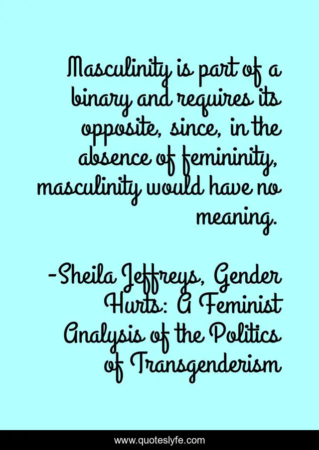 "Sheila Jeffreys, Gender Hurts: A Feminist Analysis of the Politics of Transgenderism Quotes." Quoteslyfe.com, 2025. Sat. 06 Dec. 2025. <https://www.quoteslyfe.com/quote/Masculinity-is-part-of-a-binary-and-231195>.