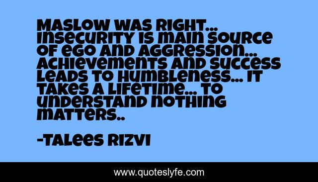 This page presents the quote "Maslow was right... Insecurity is main source of ego and aggression... Achievements and success leads to humbleness... It takes a lifetime... to understand nothing matters..". Author of this quote is Talees Rizvi. This quote is about humbleness, success, insecurity, ego, aggression, life-lessons, philosophy-of-life, achievement,.