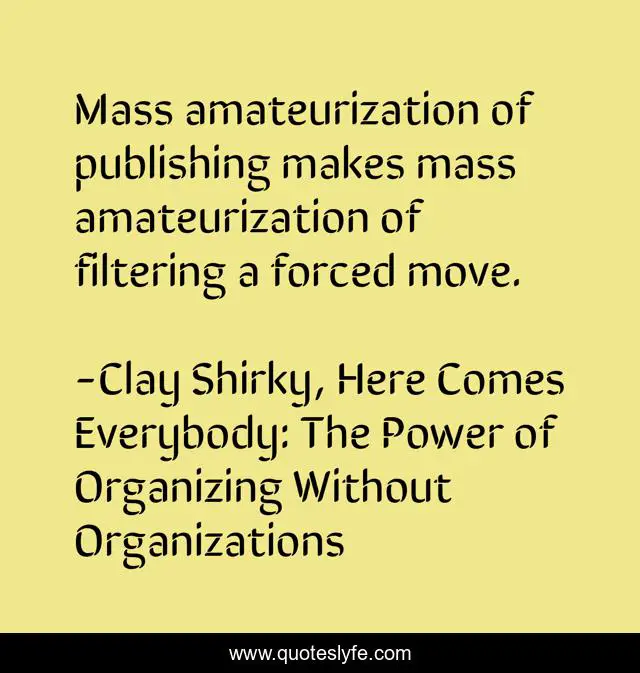 "Clay Shirky, Here Comes Everybody: The Power of Organizing Without Organizations Quotes." Quoteslyfe.com, 2025. Fri. 05 Dec. 2025. <https://www.quoteslyfe.com/quote/Mass-amateurization-of-publishing-makes-mass-amateurization-185255>.