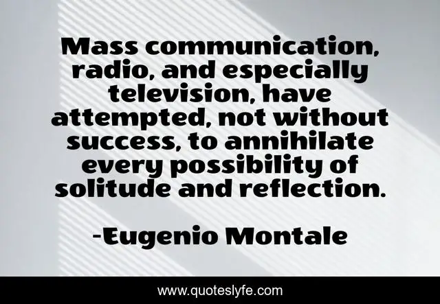 This page presents the quote "Mass communication, radio, and especially television, have attempted, not without success, to annihilate every possibility of solitude and reflection.". Author of this quote is Eugenio Montale. This quote is about reflection, success,.