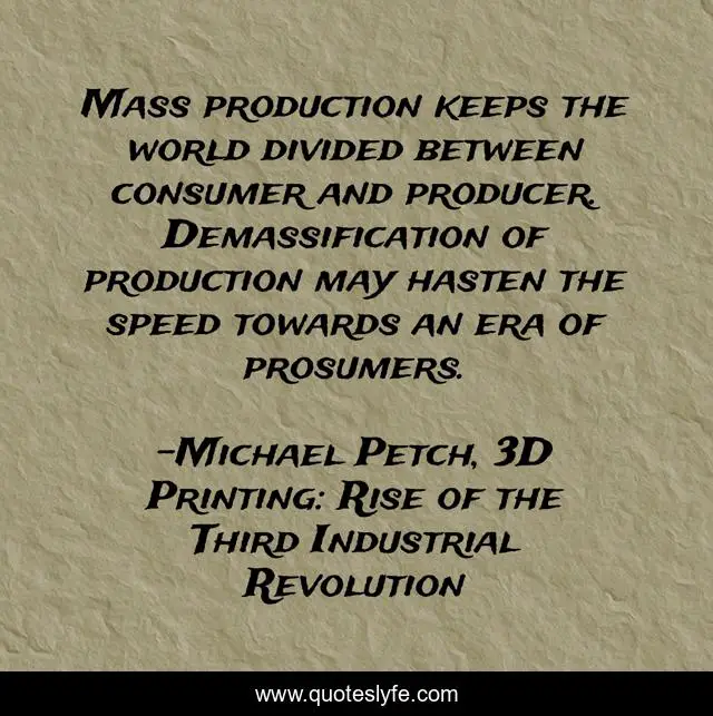 This page presents the quote "Mass production keeps the world divided between consumer and producer. Demassification of production may hasten the speed towards an era of prosumers.". Author of this quote is Michael Petch, 3D Printing: Rise of the Third Industrial Revolution. This quote is about science, future, manufacturing,.