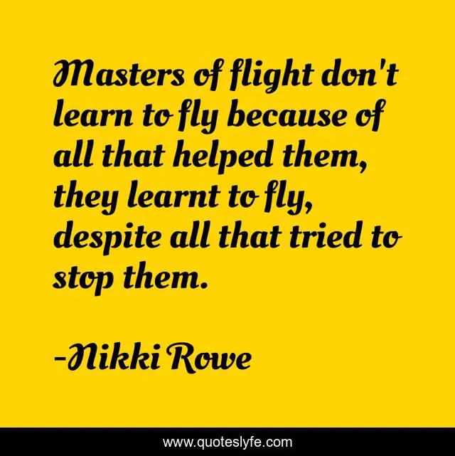 This page presents the quote "Masters of flight don't learn to fly because of all that helped them, they learnt to fly, despite all that tried to stop them.". Author of this quote is Nikki Rowe. This quote is about beauty, concious, awakening, growth, master, life-lessons,.