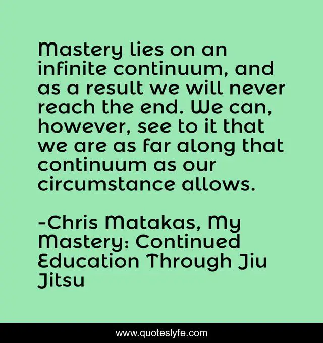 "Chris Matakas, My Mastery: Continued Education Through Jiu Jitsu Quotes." Quoteslyfe.com, 2025. Fri. 05 Dec. 2025. <https://www.quoteslyfe.com/quote/Mastery-lies-on-an-infinite-continuum-and-206376>.