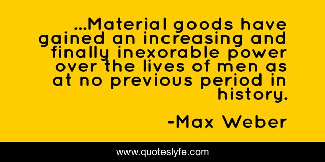 This page presents the quote "...Material goods have gained an increasing and finally inexorable power over the lives of men as at no previous period in history.". Author of this quote is Max Weber. This quote is about poverty, wealth, capitalism,.