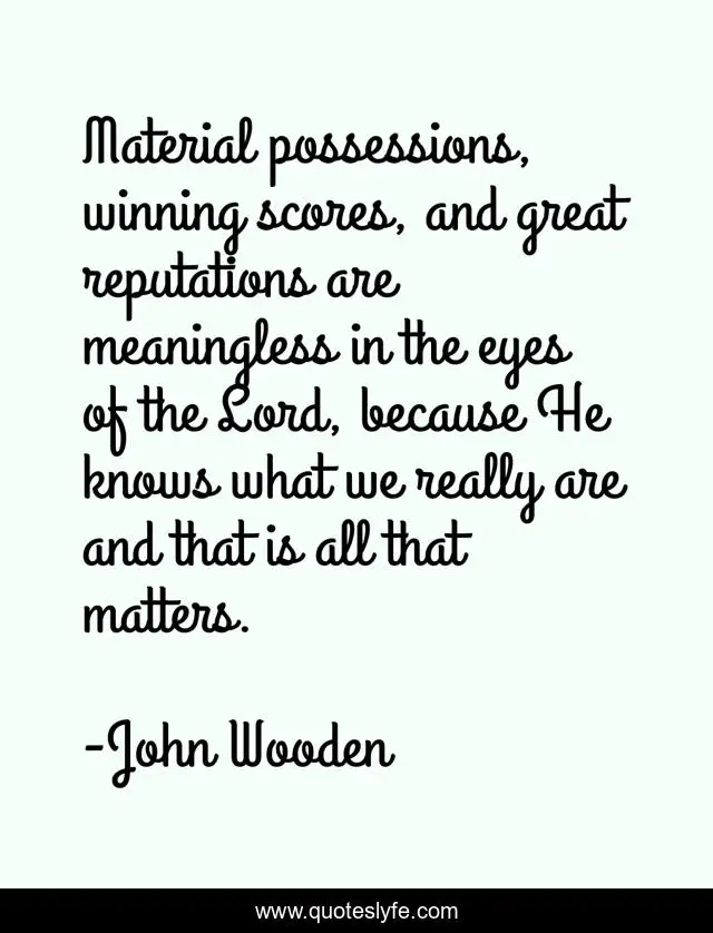 This page presents the quote "Material possessions, winning scores, and great reputations are meaningless in the eyes of the Lord, because He knows what we really are and that is all that matters.". Author of this quote is John Wooden. This quote is about great, eyes, winning,.