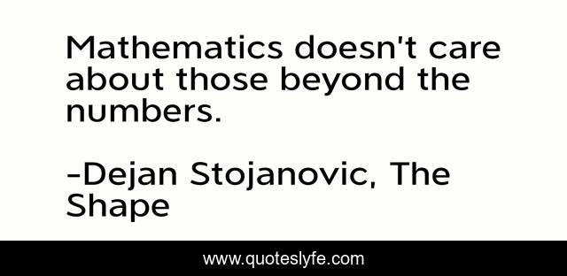 This page presents the quote "Mathematics doesn’t care about those beyond the numbers.". Author of this quote is Dejan Stojanovic, The Shape. This quote is about literature, dejan-stojanovic, poetry, wisdom, quotes, numbers, poems, mathematics, beyond,.