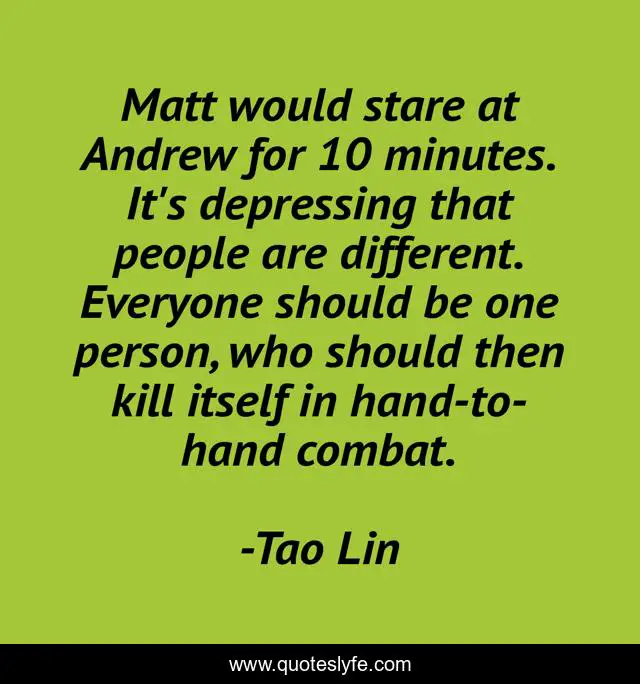 This page presents the quote "Matt would stare at Andrew for 10 minutes. It's depressing that people are different. Everyone should be one person, who should then kill itself in hand-to-hand combat.". Author of this quote is Tao Lin. This quote is about funny, comedy,.