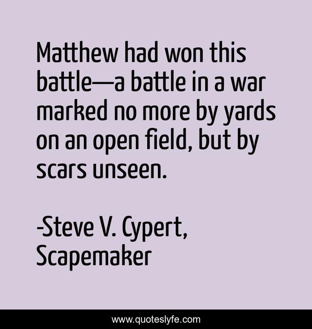 This page presents the quote "Matthew had won this battle—a battle in a war marked no more by yards on an open field, but by scars unseen.". Author of this quote is Steve V. Cypert, Scapemaker. This quote is about battle, war-wounds, football, won, win,.