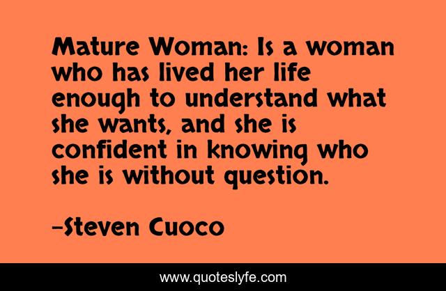 This page presents the quote "Mature Woman: Is a woman who has lived her life enough to understand what she wants, and she is confident in knowing who she is without question.". Author of this quote is Steven Cuoco. This quote is about woman, daily-inspiration, woman-s-strength, brainy, inspirational, quote-of-the-day, enthusiasm, quotes-to-live-by, daily-motivation,.