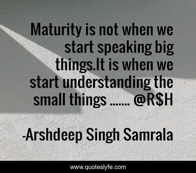 This page presents the quote "Maturity is not when we start speaking big things.It is when we start understanding the small things ....... @R$H". Author of this quote is Arshdeep Singh Samrala. This quote is about big-think, love, love-and-sayings, small-things, understanding, maturity, arshdeep-singh-samrala, arsh-samrala, affection,.