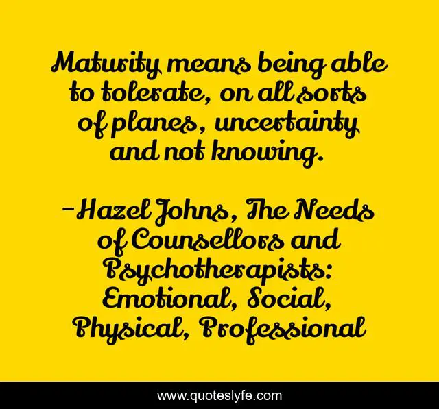 This page presents the quote "Maturity means being able to tolerate, on all sorts of planes, uncertainty and not knowing.". Author of this quote is Hazel Johns, The Needs of Counsellors and Psychotherapists: Emotional, Social, Physical, Professional. This quote is about maturity, uncertainty, counselling,.
