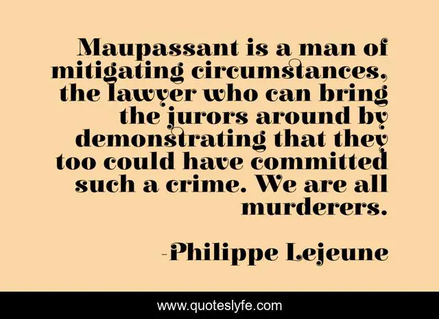 This page presents the quote "Maupassant is a man of mitigating circumstances, the lawyer who can bring the jurors around by demonstrating that they too could have committed such a crime. We are all murderers.". Author of this quote is Philippe Lejeune. This quote is about maupassant, crime,.