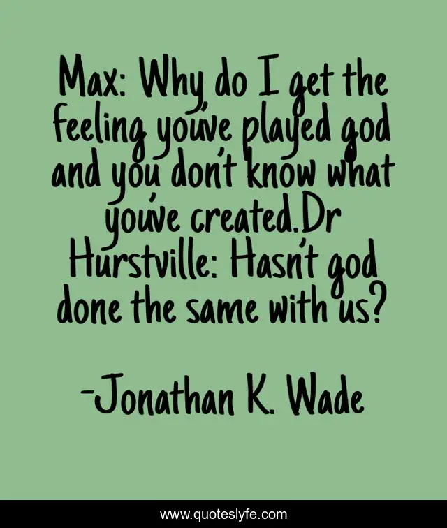This page presents the quote "Max: Why do I get the feeling you’ve played god and you don’t know what you’ve created.Dr Hurstville: Hasn’t god done the same with us?". Author of this quote is Jonathan K. Wade. This quote is about existentialism, sci-fi, fiction,.
