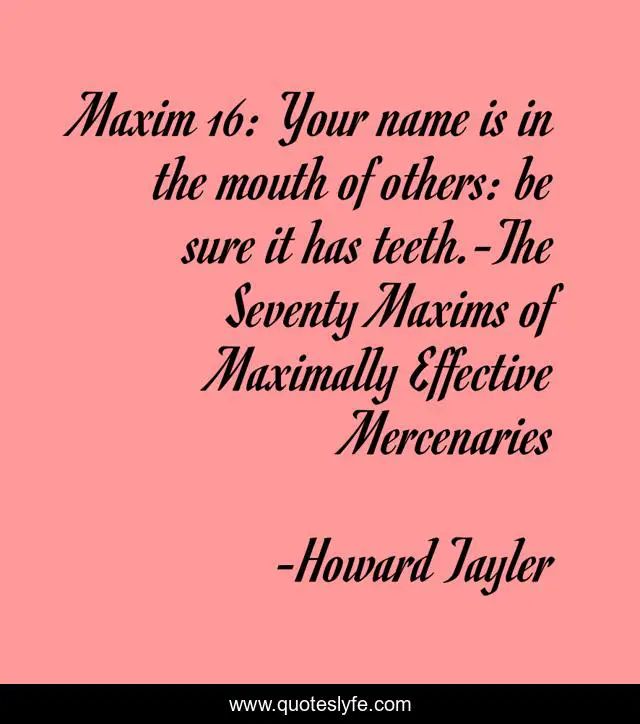 This page presents the quote "Maxim 16: Your name is in the mouth of others: be sure it has teeth.-The Seventy Maxims of Maximally Effective Mercenaries". Author of this quote is Howard Tayler. This quote is about humour, names, rules-to-live-by, teeth,.